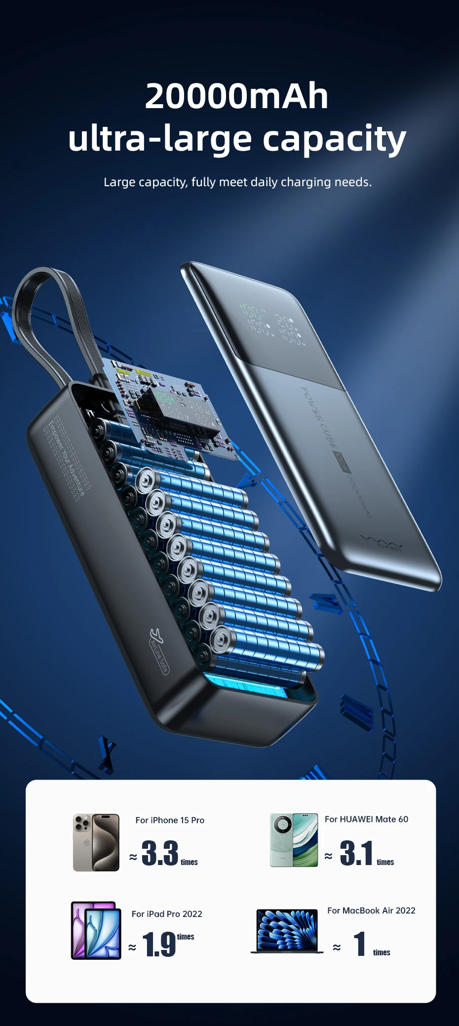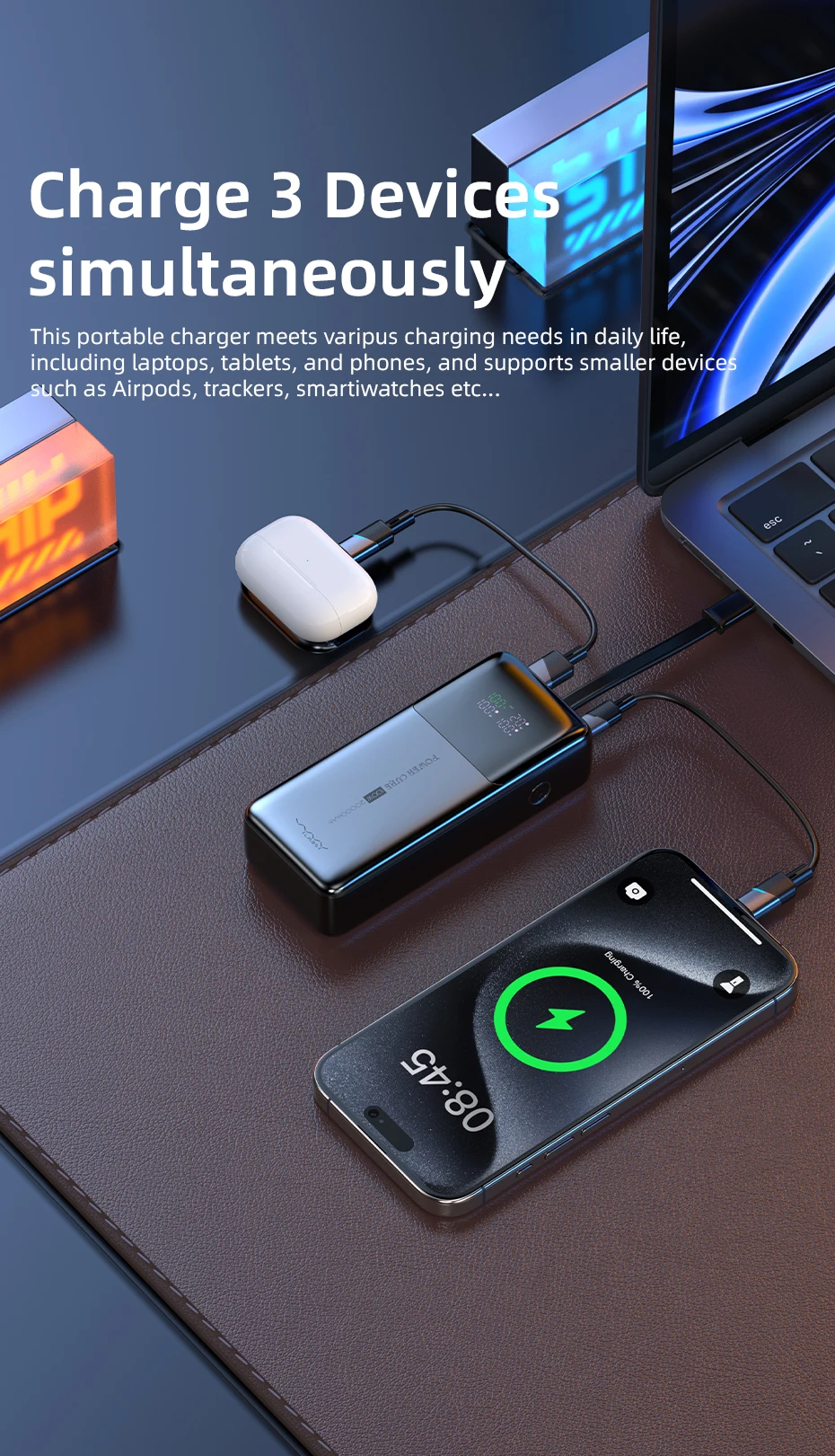 This portable charger meets varipus charging needs in daily life,including laptops, tablets, and phones, and supports smaller devicessuch as Airpods, trackers, smartiwatches etc…