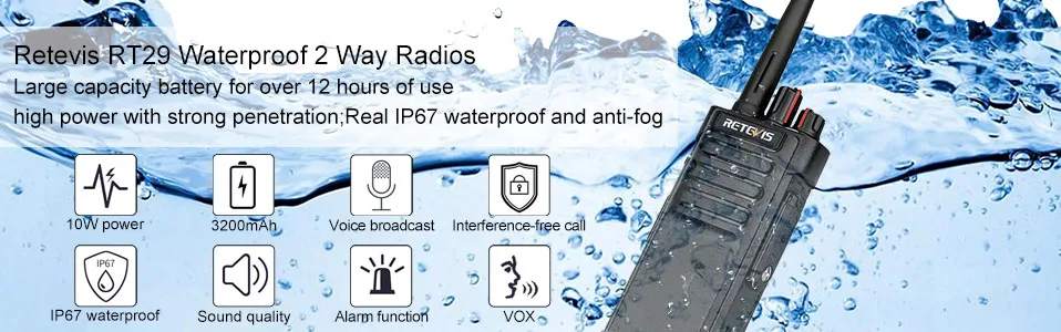 Compared to the ordinary waterproof walkie talkies on the market, our Retevis RT29 Â walkie-talkie is a real IP67 waterproof walkie talkie;6 grades dust proof means it will completely prevent dust invasion;7 grades waterproof is submersible in up to 1 meter of water for up to 30 minutes;ideal for commercial and outdoor activities sunch as construction site,cruise ship and commercial activities.
