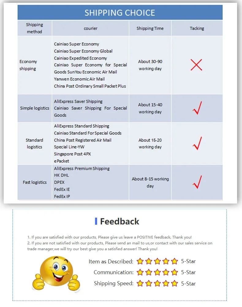 1.We offer you the cheapest pric,so there is no logistics information after the package leaves China.You can receive the package under normal circumstances.If you did not receive the package under the protection of time,please contact us,we will handle the replacement or refund for you,thank you.