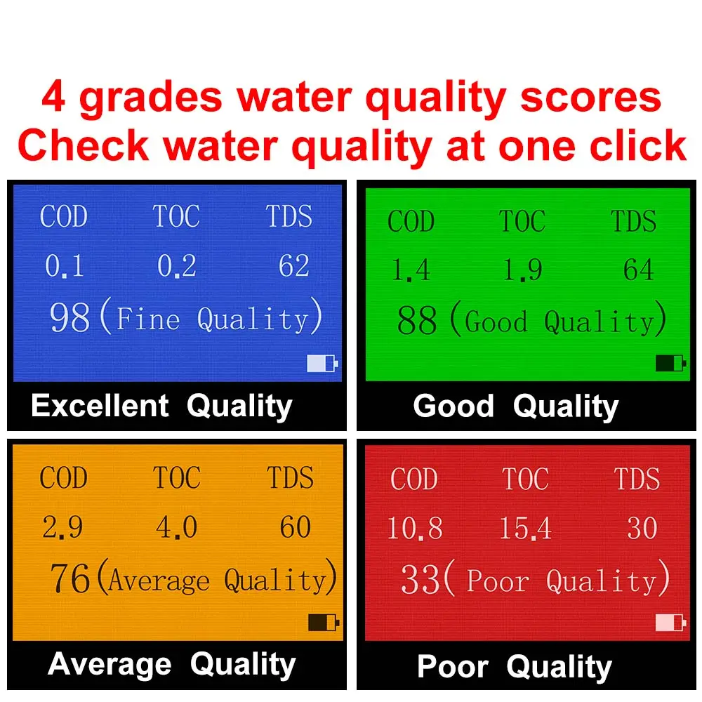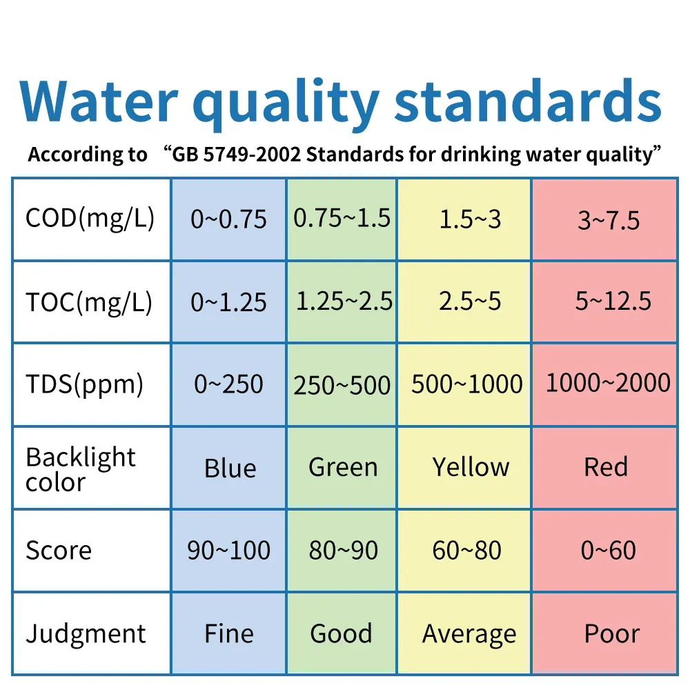 LS310 tds water quality tester is an instrument dedicated to testing the quality of drinking water. The COD, TOC and UV275 water quality parameters of drinking water are measured by ultraviolet absorbance method, and the TDS and conductivity of drinking water are obtained by measuring the conductance between electrodes. The water quality tester can measure 6 water quality indicators at the same time, and judge the water quality in an all-round way. At the same time, the tds water quality tester has an intelligent scoring function, which can quickly judge the water quality level. The color of the LCD backlight indicates the four levels of excellent water quality, good water quality, average water quality and poor water quality. LS310 water quality tester for drinking water is mainly used to detect drinking water such as tap water, purified water and underground water.
