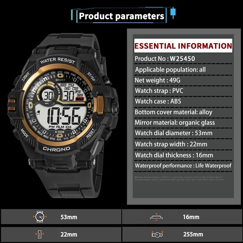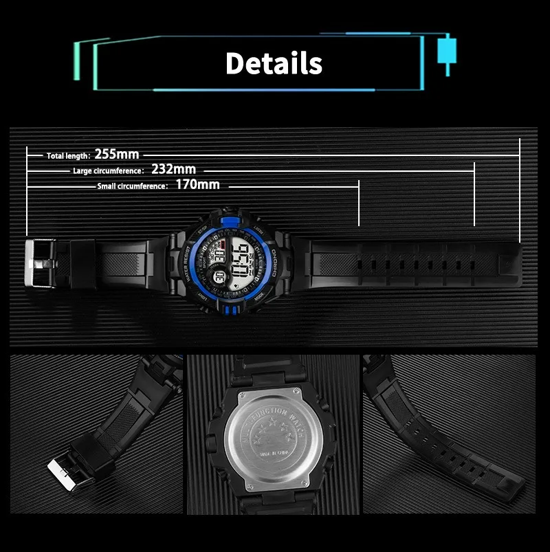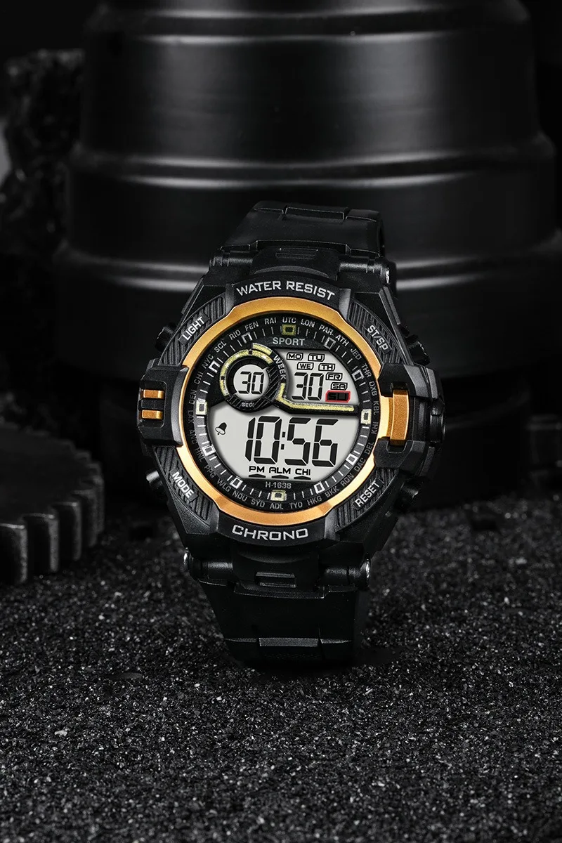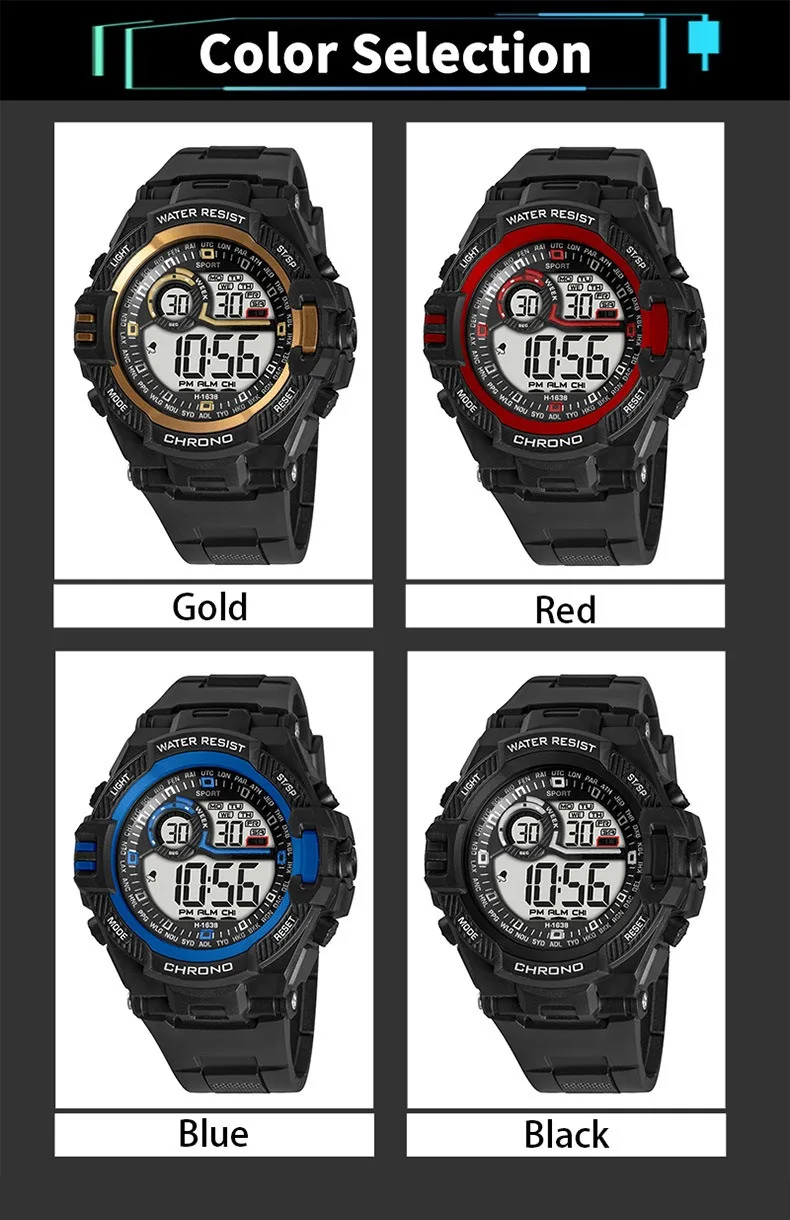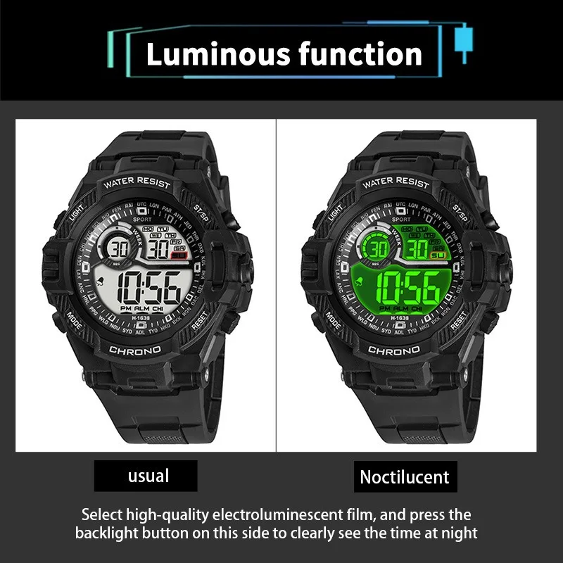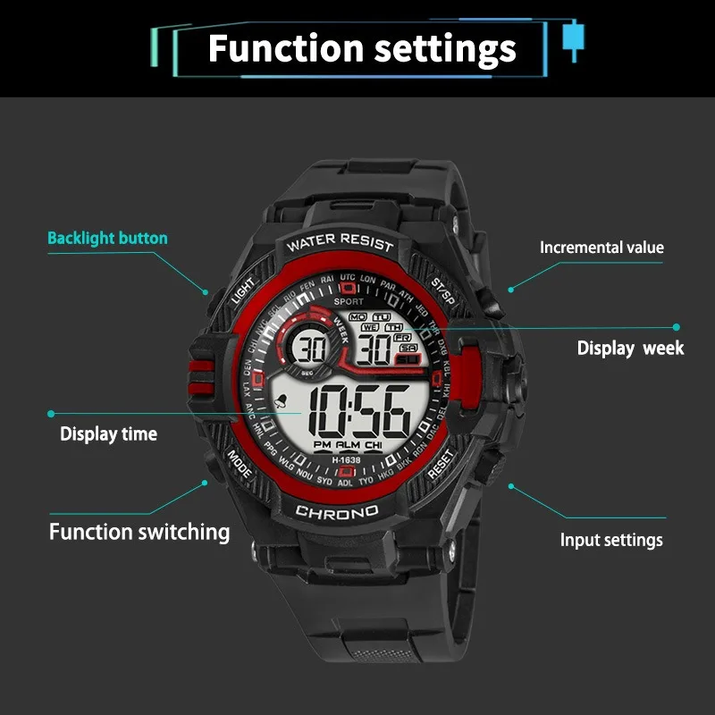 - Feature: Stop Watch,Back Light,Shock Resistant,Led Display,Repeater,Luminous,Complete Calendar,Water-Resistance,Alarm,Week Display