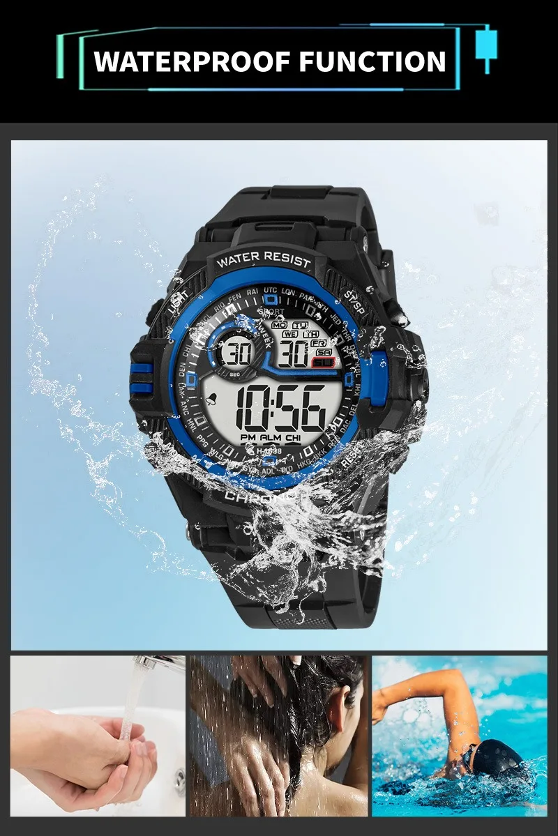 –Multifunction Watch: stopwatch, alarm clock, hourly reminder, luminous, date display, time display, week display, 12/24 hour conversion, waterproof