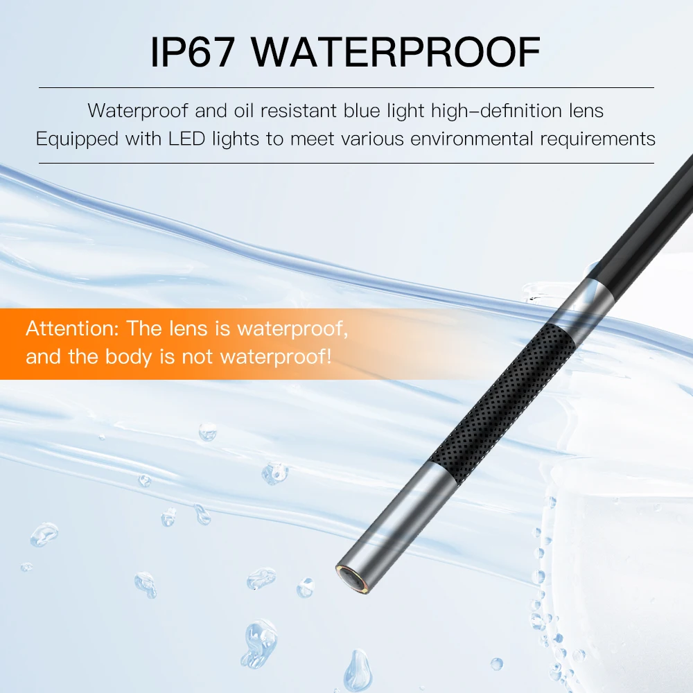 6.Waterproof camera head & cable meet IP67 standard for viewing images and videos directly on you cellphone .