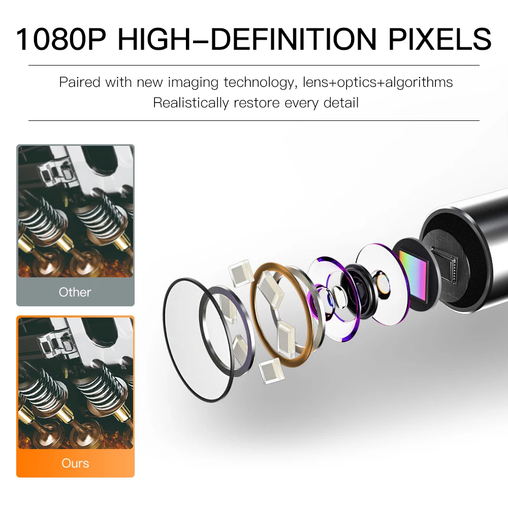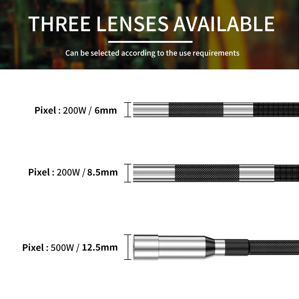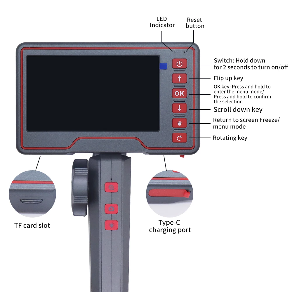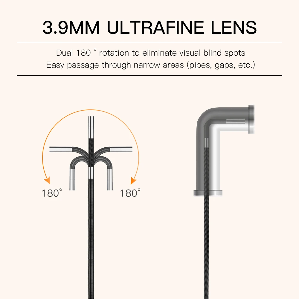 The product has a unique temperature protection function and is equipped with a two-way 180° steering detection function, which allows users to take small probes into a small space, and then transmit vivid, clear and all-round video and pictures to the mobile phone through the cable and shown on the screen.