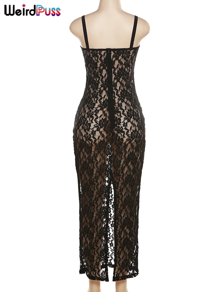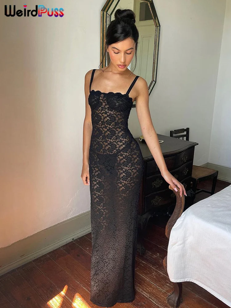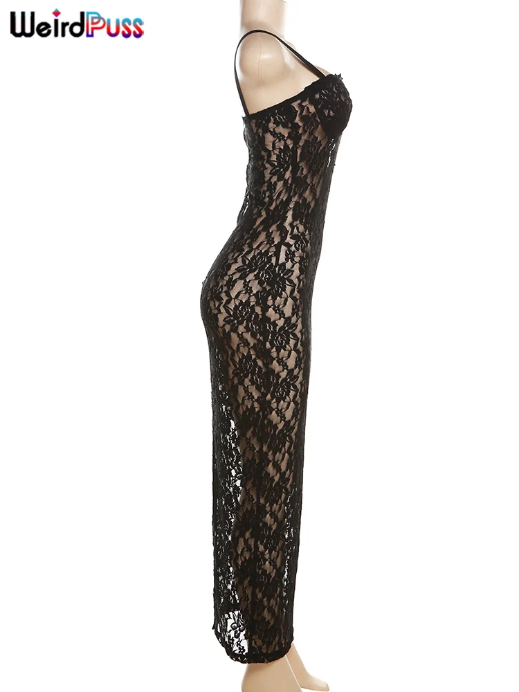 Weird Puss Lace Black Women Maxi Dress See Through Sleeveless Ladies Sexy Coquette Nightclub Party Bodycon Slim Fit Vestidos