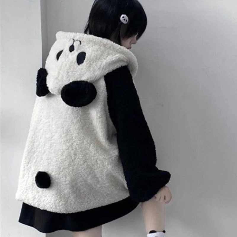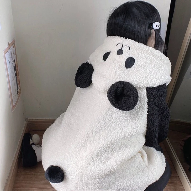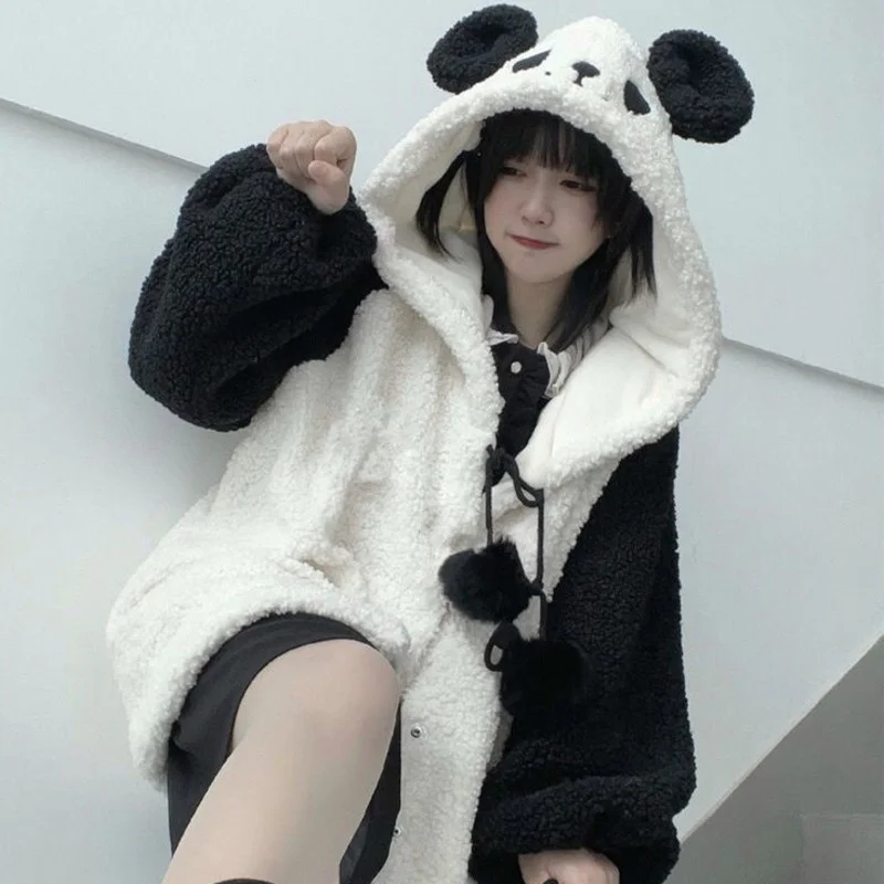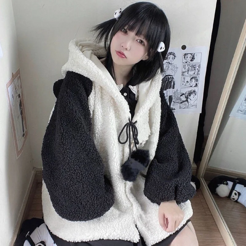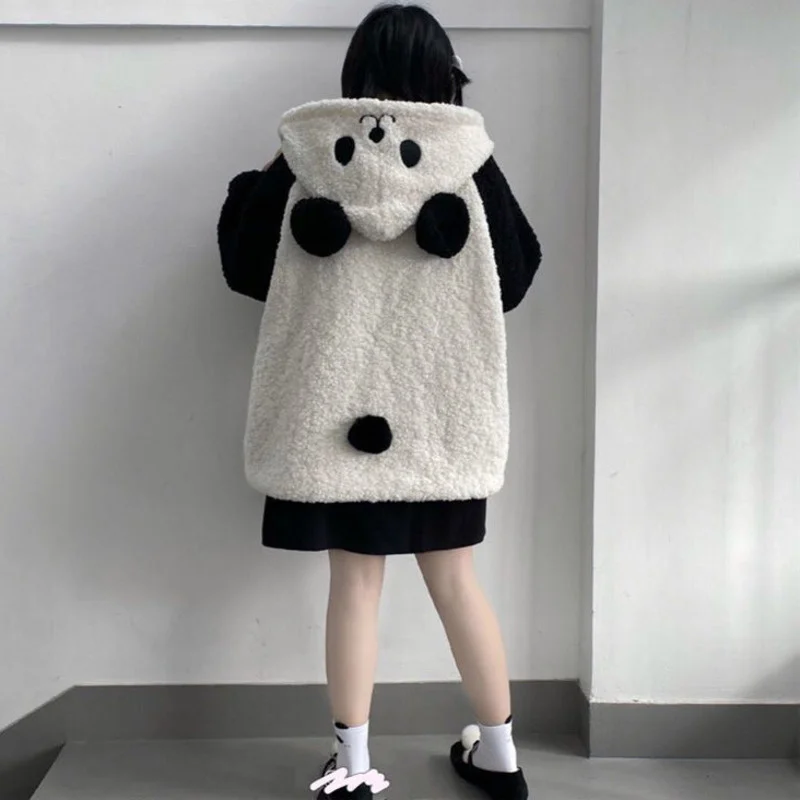 Winter Kawaii Hoodies Women Panda Ears Hooded Sweatshirt Plush Balls Zip-up Loose Cute Sudadera Teenager School Girls JK Clothes