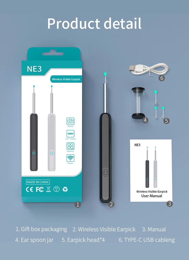 【NE3 Wireless Otoscope】Natfire ne3 upgraded on the basis of previous generation. The product is fully FCC, RoHS, CE compliant. we upgrade harmless accessories. suitable for oily ear,which can be safety to meet different people in different occasions.