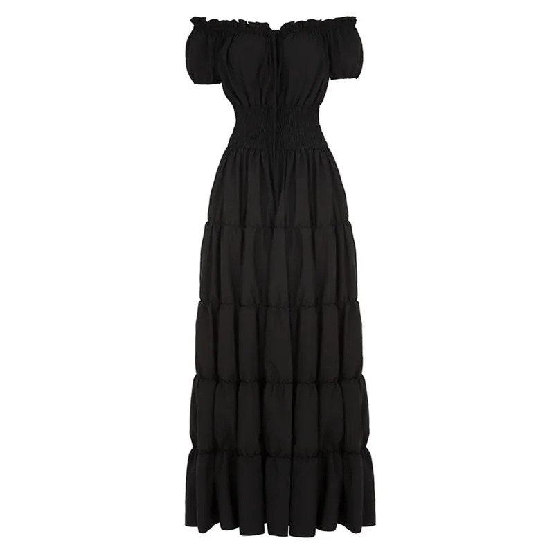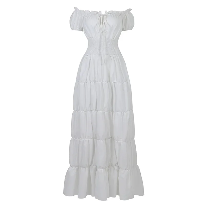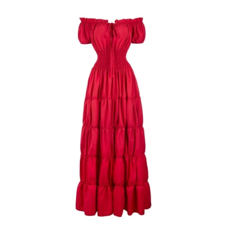 Women Medieval Renaissance Dress Boho Petticoat Short Sleeves Off Shoulder Smocked Waist Retro Pleated Long Dress Costume