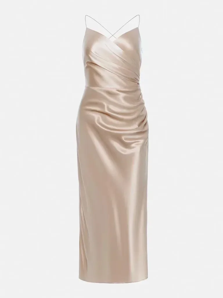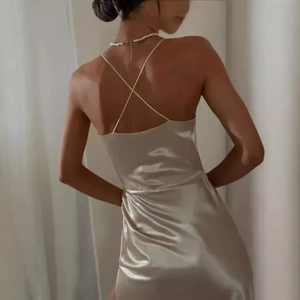 Women Satin Fashion Strap Backless Sexy Slit Dress Sleeveless High Waist Solid Color Long Dress