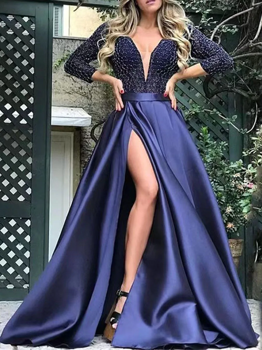 Women’s Dress Spring Sexy Slim Lace Stitching Split Dress Women’s Fashion Long Sleeve V-neck High Waist Party Formal Dress