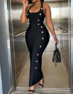 Womens Dresses 2024 Summer Fashion Halter Sleeveless Buttoned Casual Plain Maxi Bodycon Evening Dress
