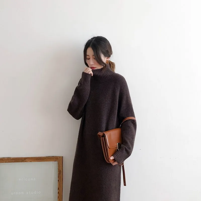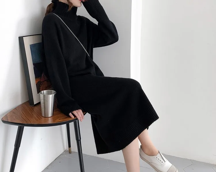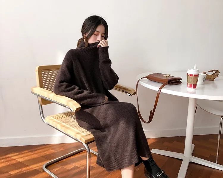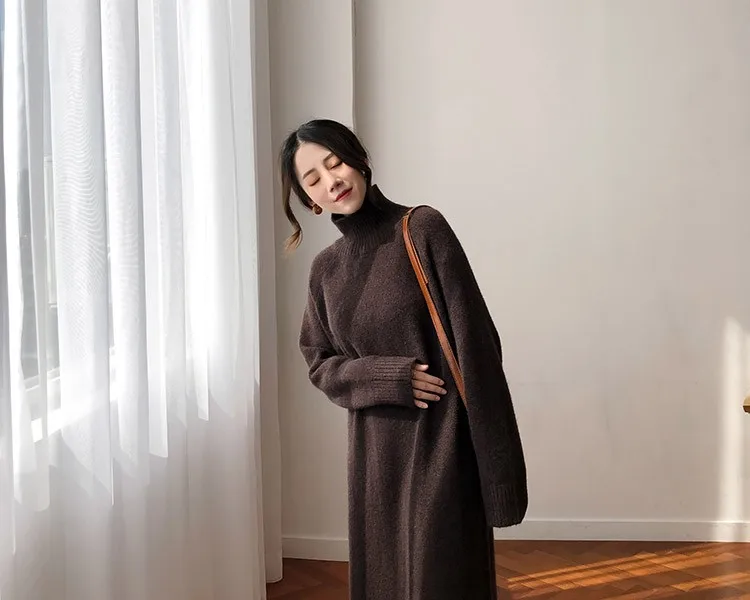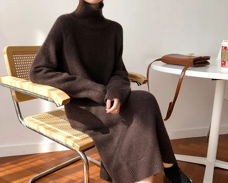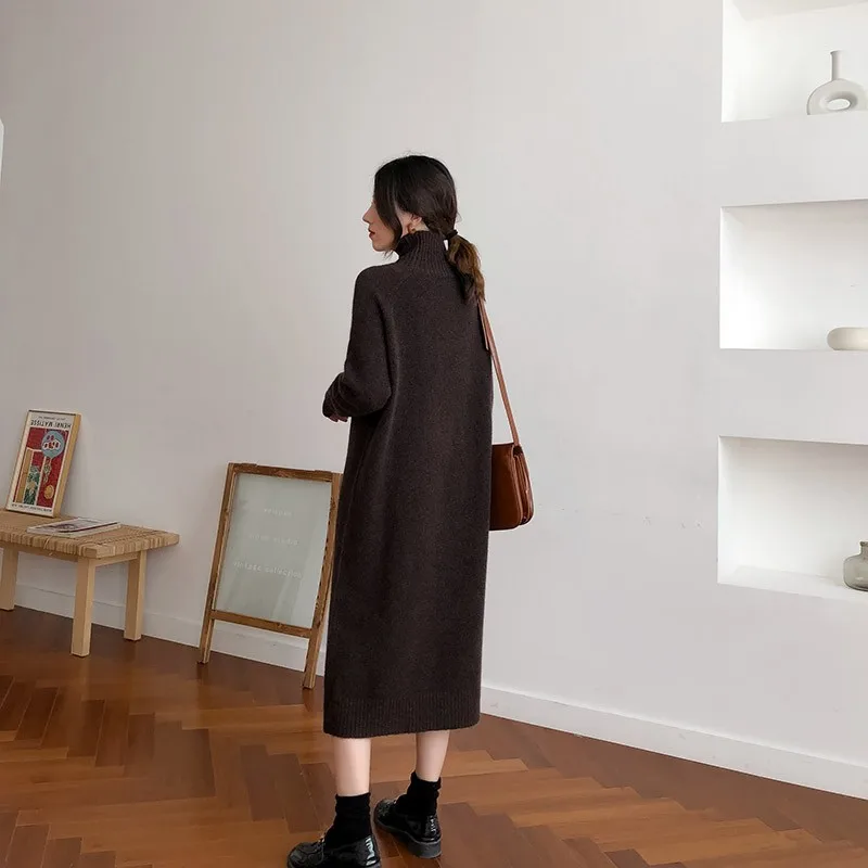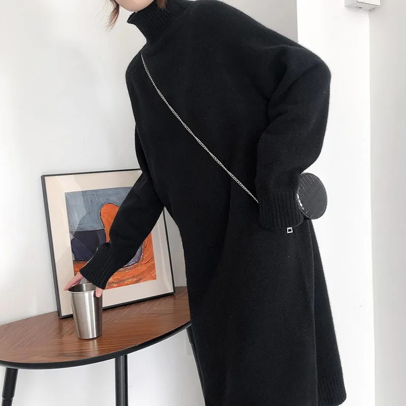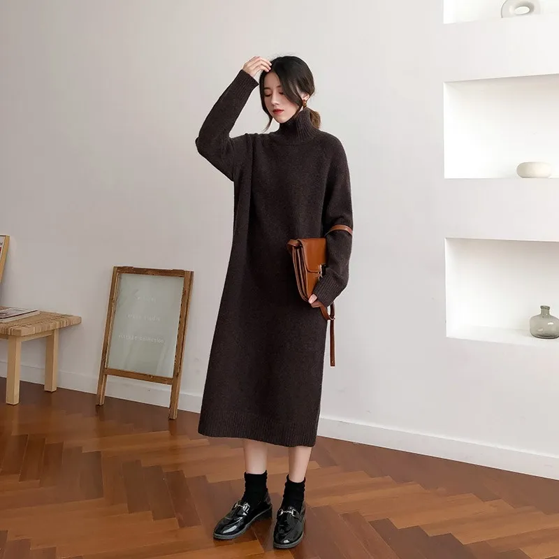Women’s Mid-length Pure Cashmere Sweater Dress, Loose Knitted Bottoming Sweater, High Collar, Over the Knee, Plus Size
