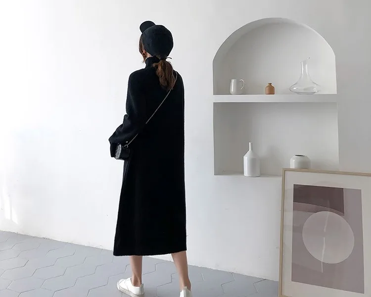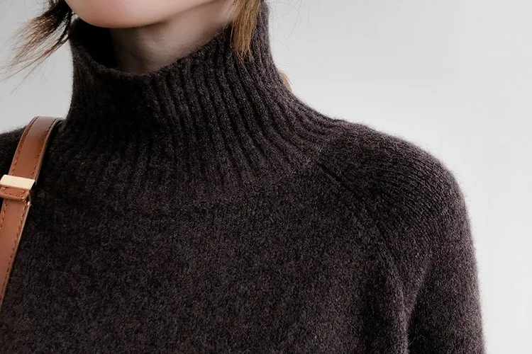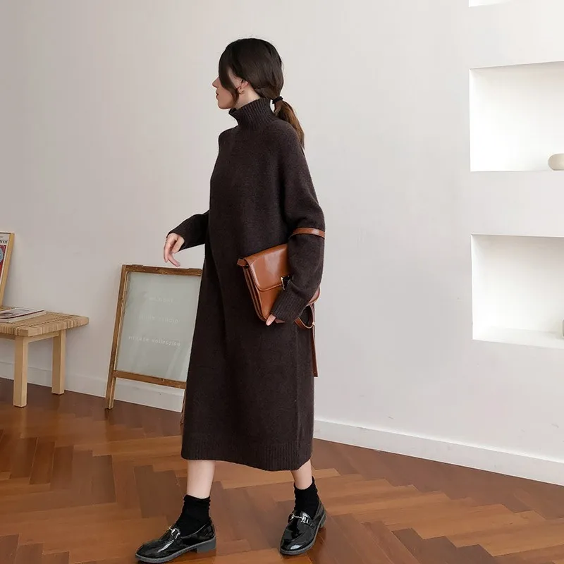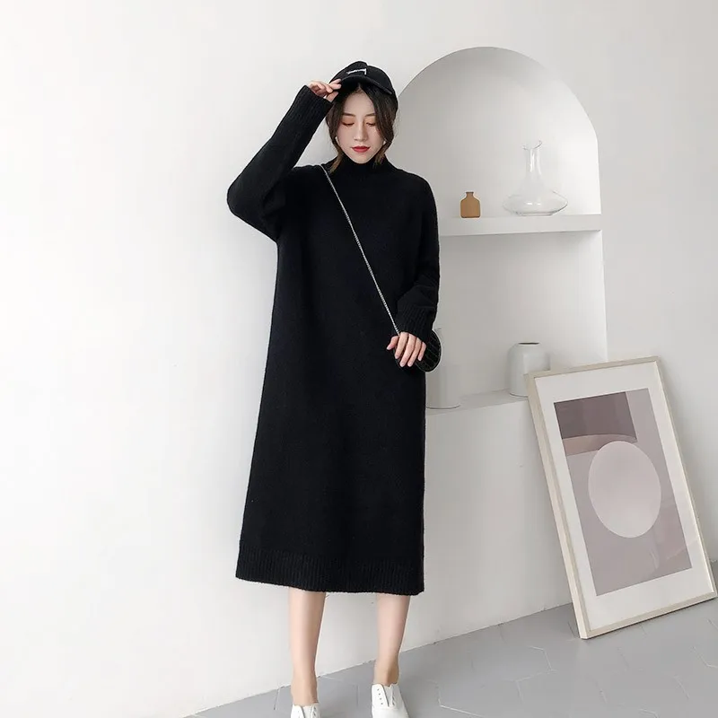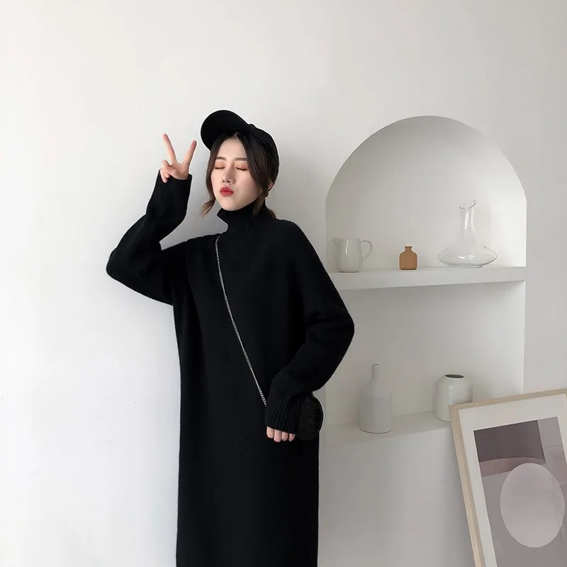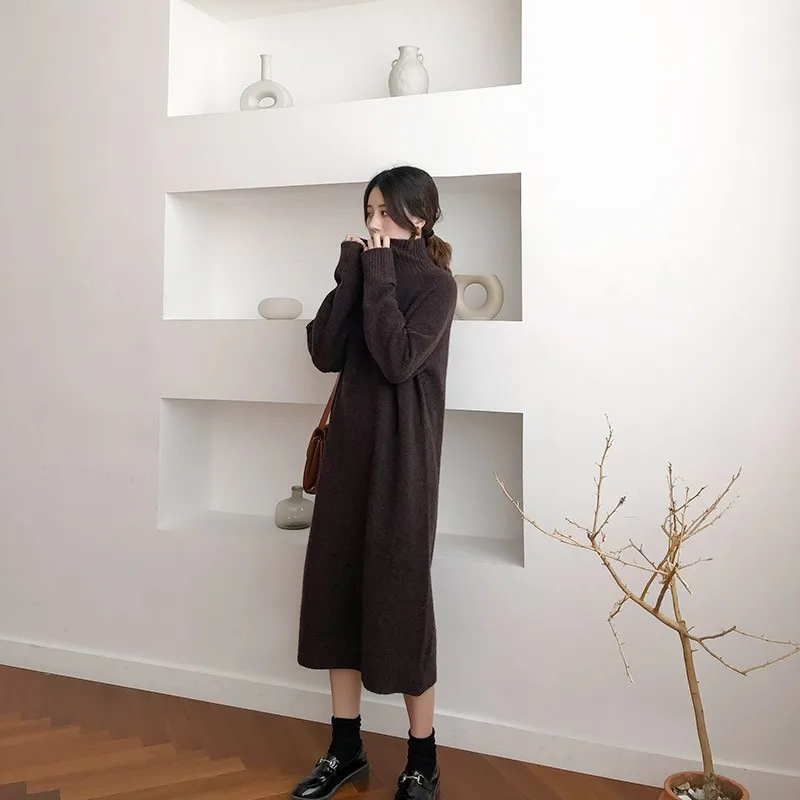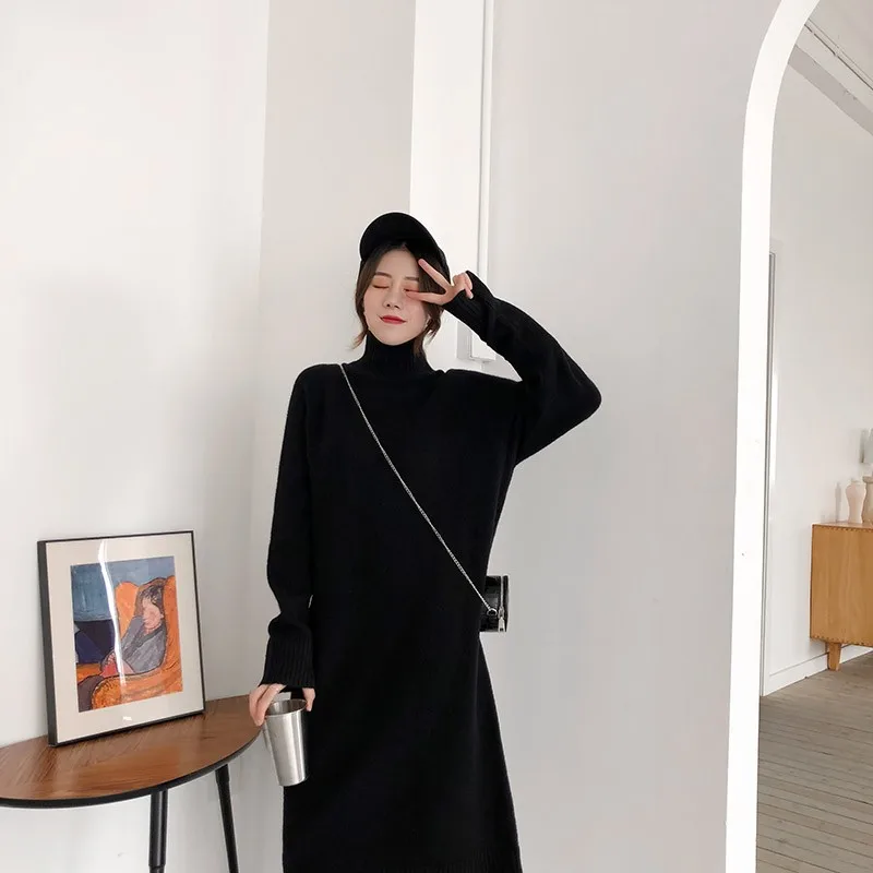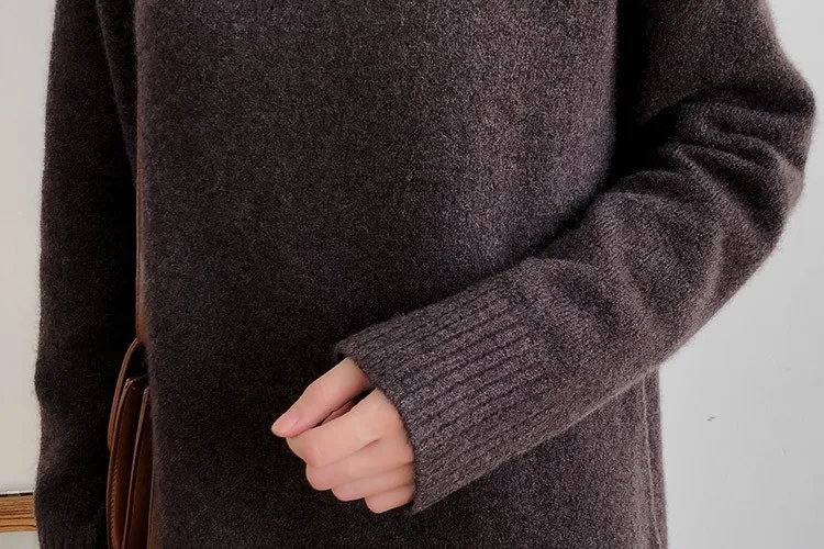 Women’s Mid-length Pure Cashmere Sweater Dress, Loose Knitted Bottoming Sweater, High Collar, Over the Knee, Plus Size