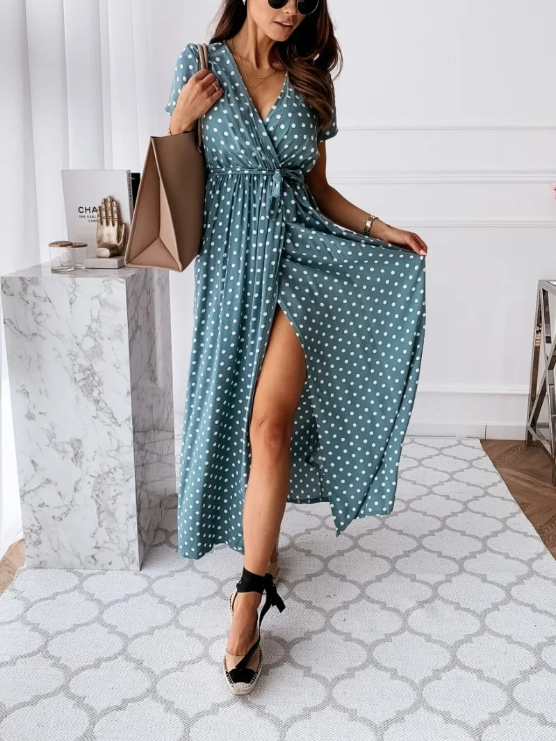 Women’s Summer Short Sleeved V-neck and Ankle Skirt Bohemian Polka Dot Printed Dress Long Skirt