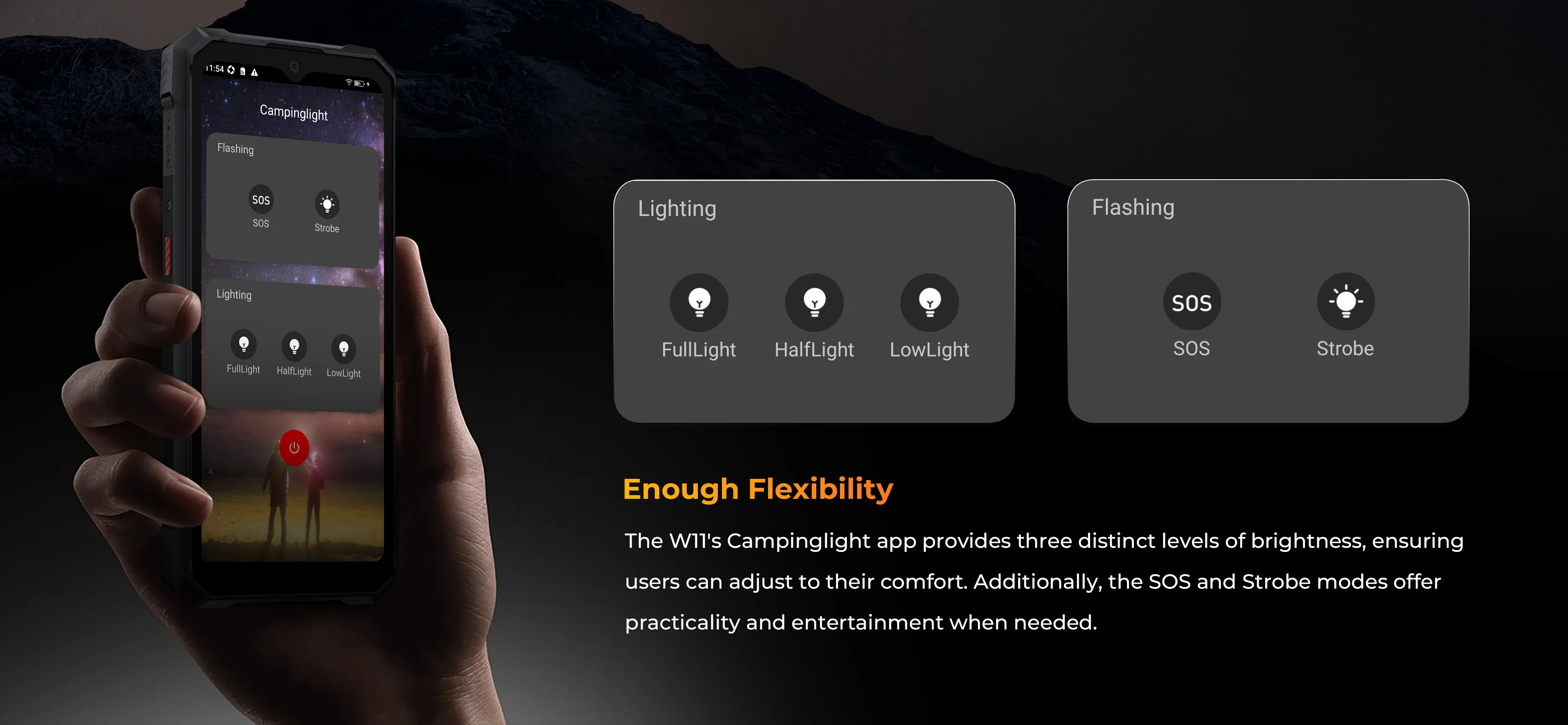 HOTWAV W11 rocks super strong LED camping lighton the back with impressive intensity and brightness, offering up to 280 lumen. Its power is sustained by an ultra 20800mAh battery for prolonged usage. With around 510 lighting beads and  up to 6 watts of power, this LED light efficiently projects a beam over long distances. Additionally, it’s built to endure wet or harsh conditions, boasting high water resistance and rugged durability against rough handling.