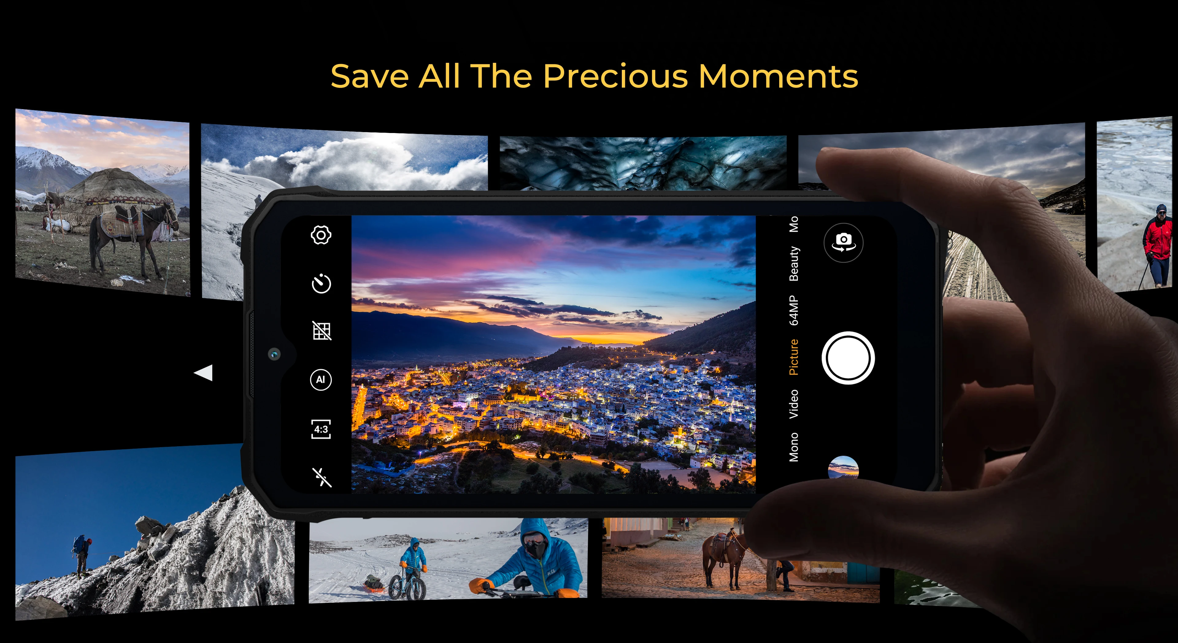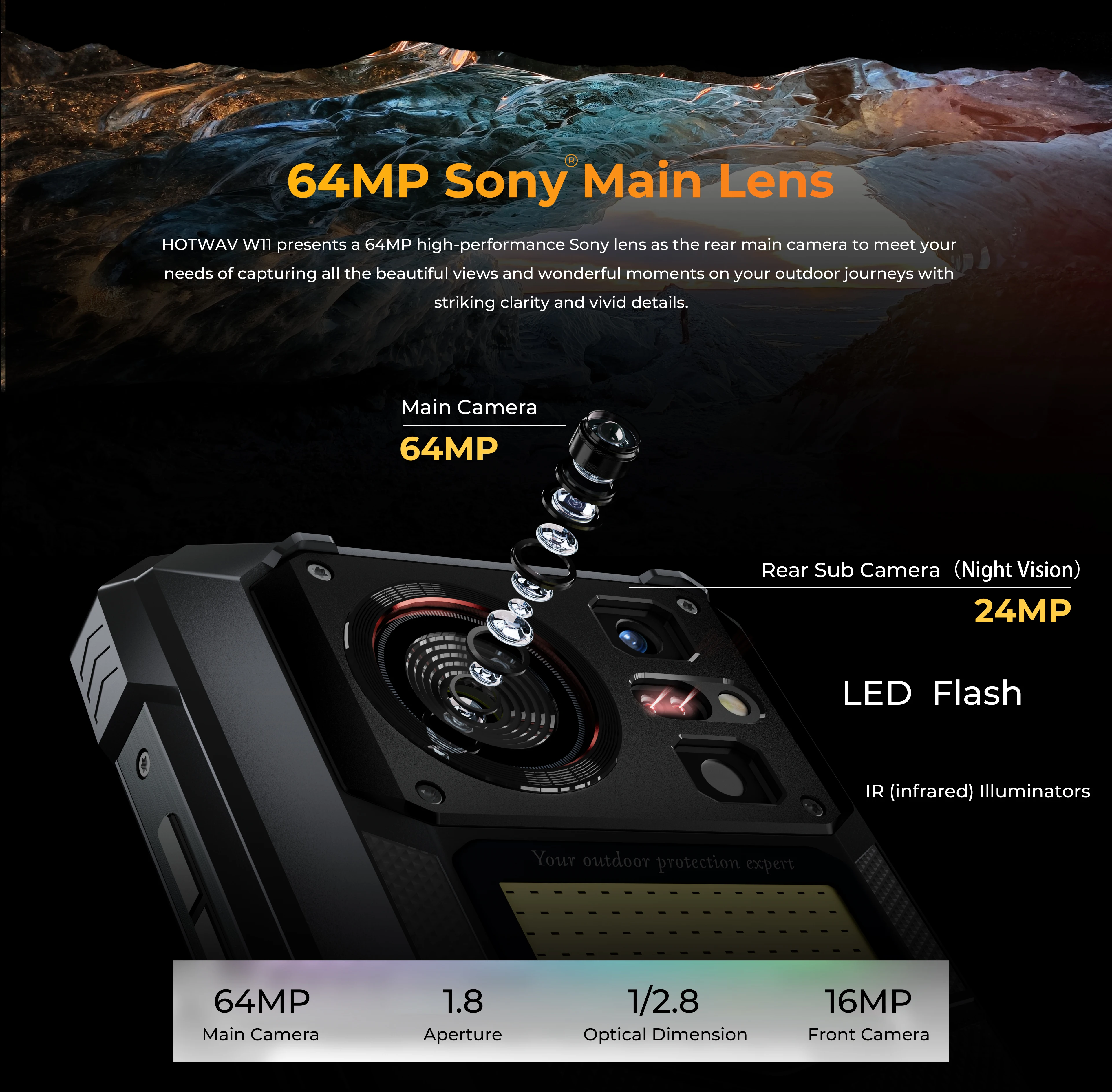 HOTWAV W11 presents a 64MP high-performance Sony lens as the rear main camera to meet your needs of capturing all the beautiful views and wonderful moments on your outdoor journeys with striking clarity and vivid details.
