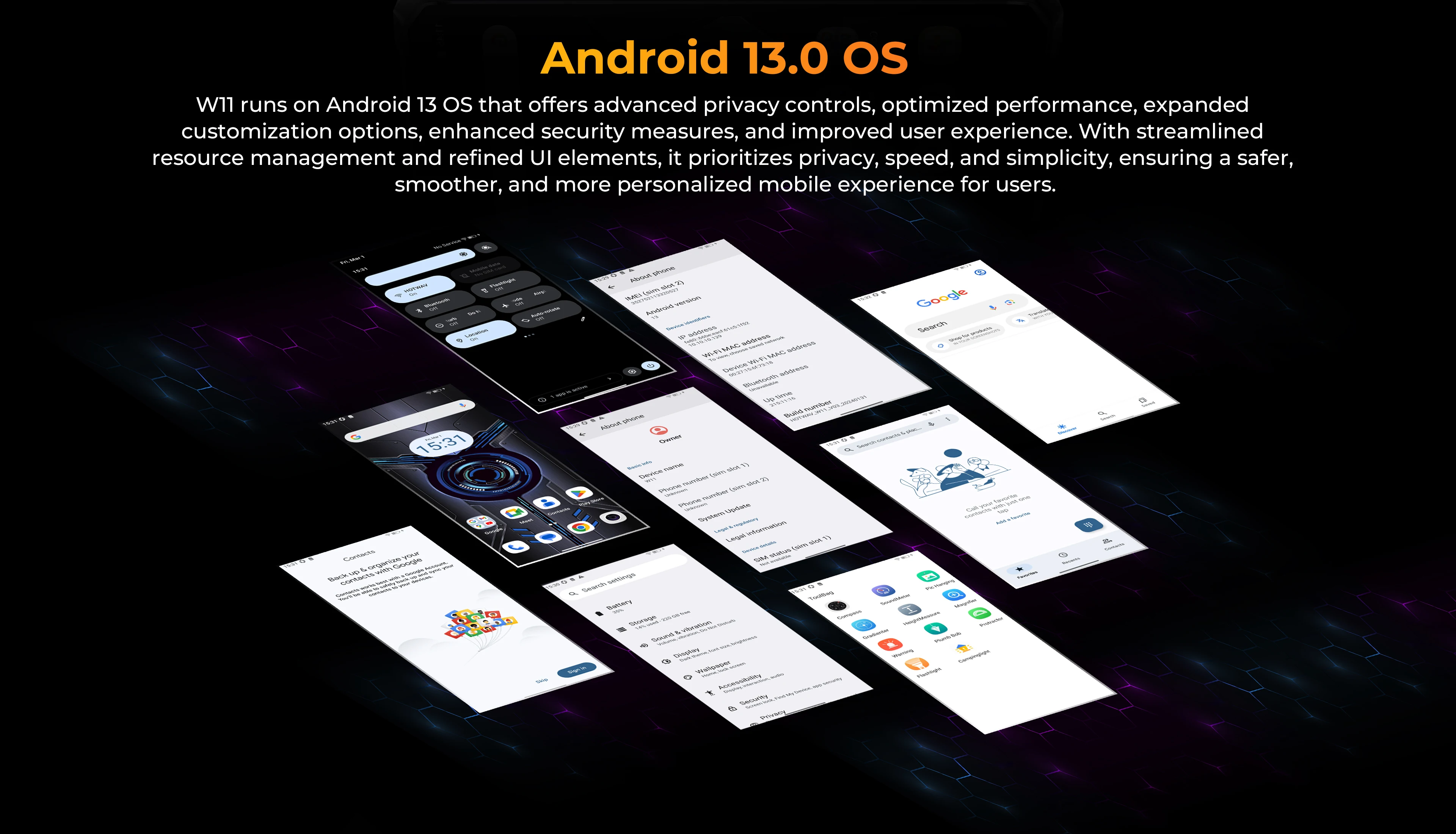 W11 runs on Android 13 OS that offers advanced privacy controls, optimized performance, expanded customization options, enhanced security measures and improved user experience. With streamlined resource management and refined UIelements, it prioritizes privacy, speed, and simplicity, ensuring a safer, smoother and more personalized mobile experience for users.