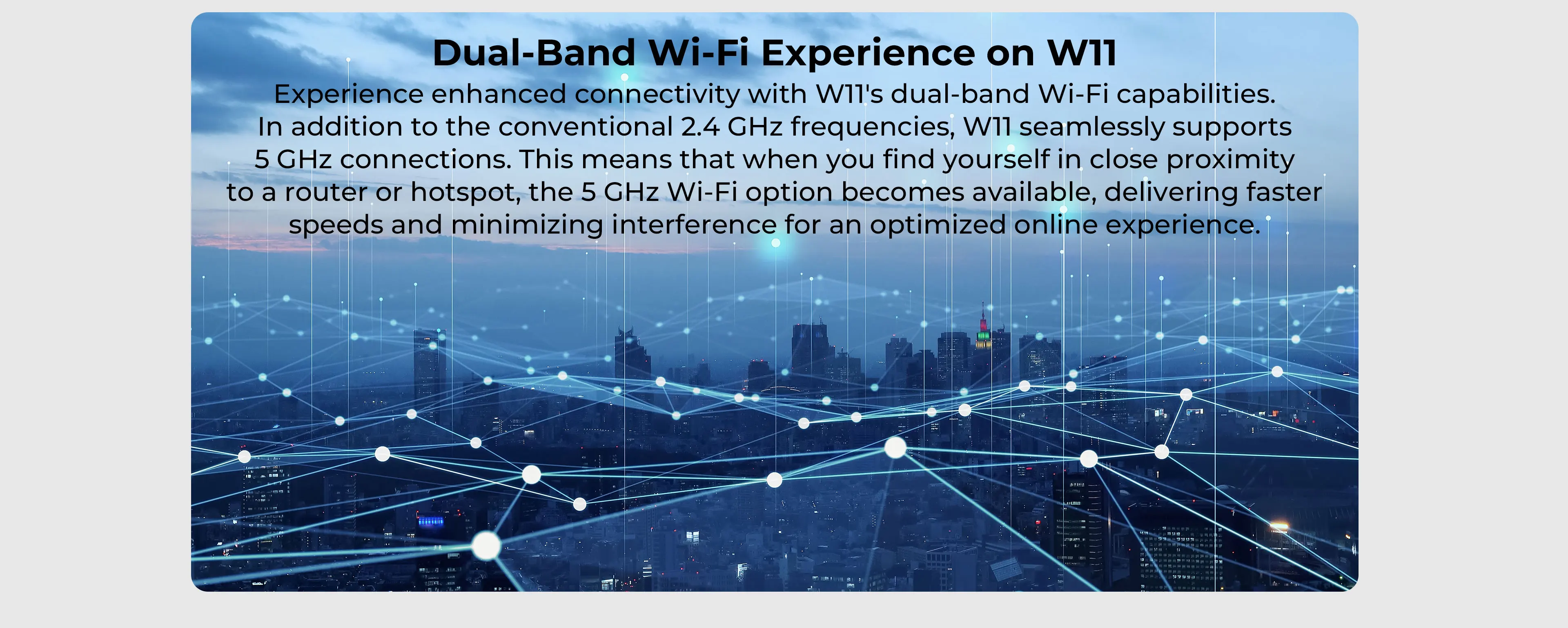 Experience enhanced connectivity with W11’s dual-band Wi-Fi capabilities, In addition to the conventional 2.4 GHz frequencies, W11 seamlessly supports 5 GHz connections.This means that when you find yourself in close proximity to a router or hot spot, the 5 GHz Wi-Fi option becomes available, delivering faster speeds and minimizing interferenceforan optimized online experience.