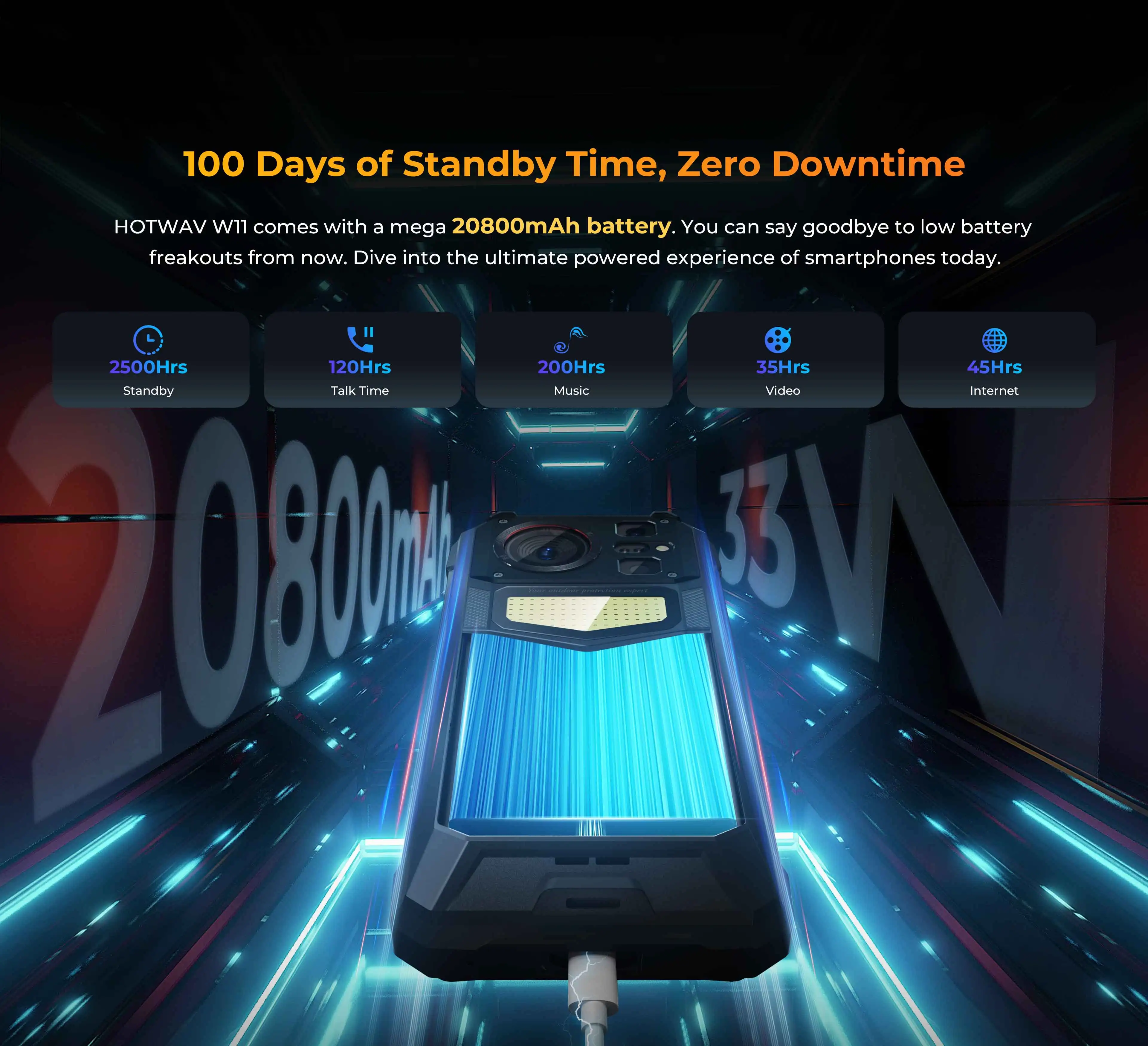 [World Premeire] HOTWAV W11 Rugged Phone 20800mAh 280LM Flashlight 6.6” FHD+ Smartphone 33W 24MP Night Vision Mobile Phone