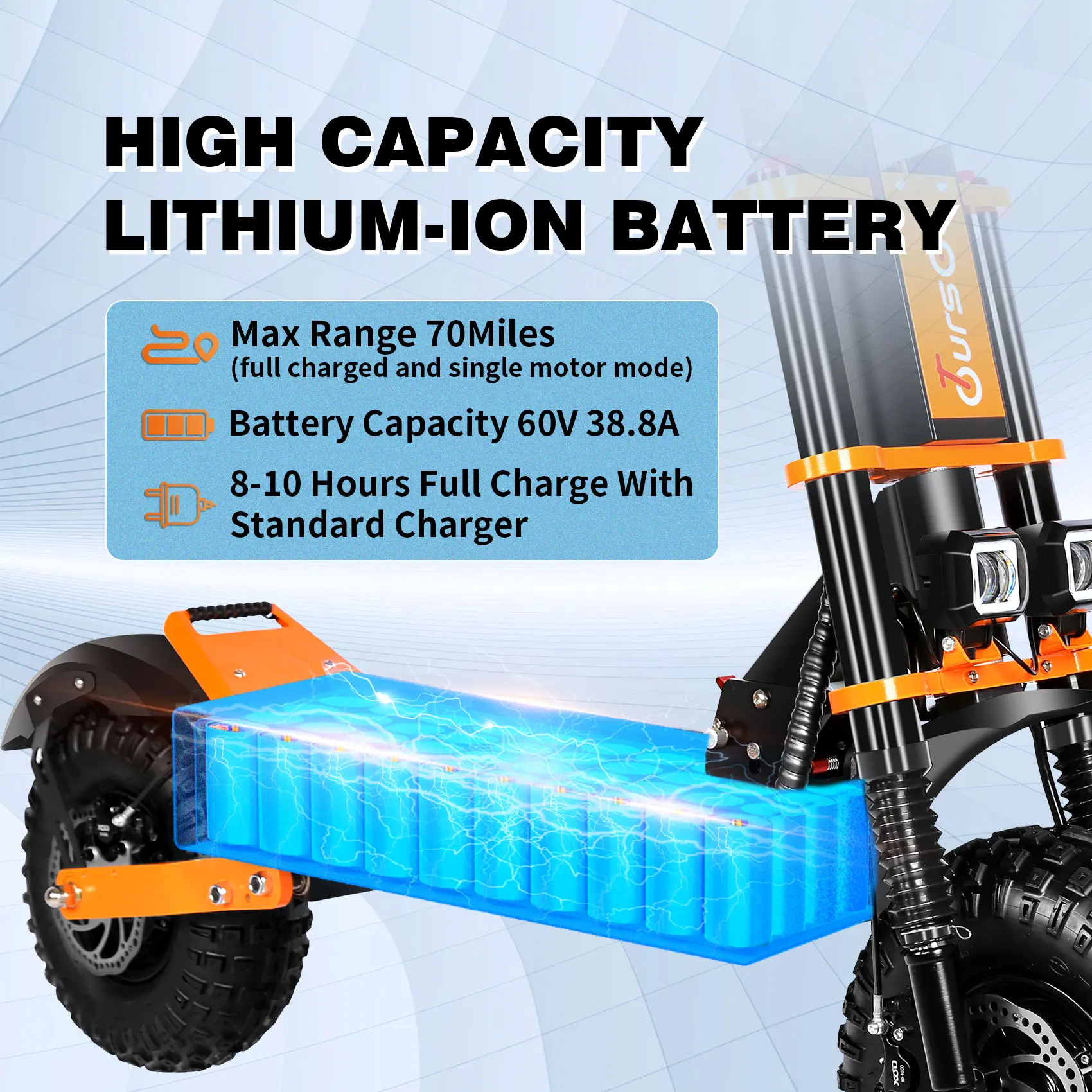 🚀【Powerful Performance and High-Speed Thrills】The Toursor electric scooter is equipped with dual 4000W brushless hub motors, delivering a total power output of 8000W and a top speed of 60mph. It effortlessly handles various road conditions and supports a maximum rider weight of 440 lbs, making it ideal for riders of all sizes who crave speed and power.