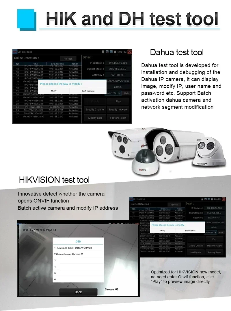 IPC TEST (Non-ONVIF test), HIK test tool (Hikvision camera),DH test tool (Dahua camera)
