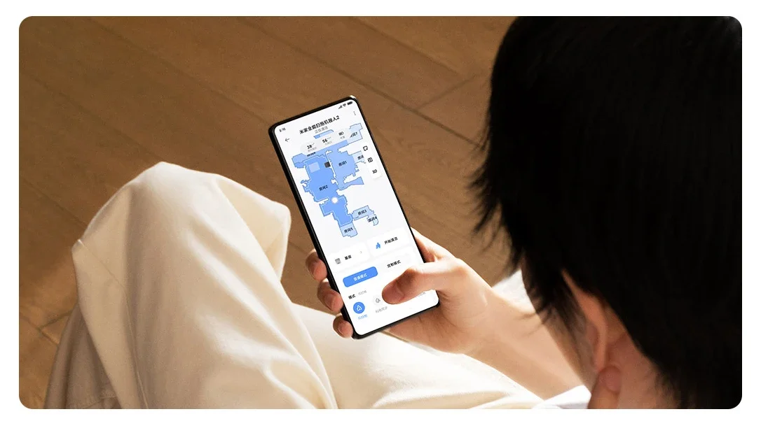 Cuando esté fuera de casa, puede ordenar a distancia el robot que aspire y limpie la sala de estar, el dormitorio o el suelo de la cocina.