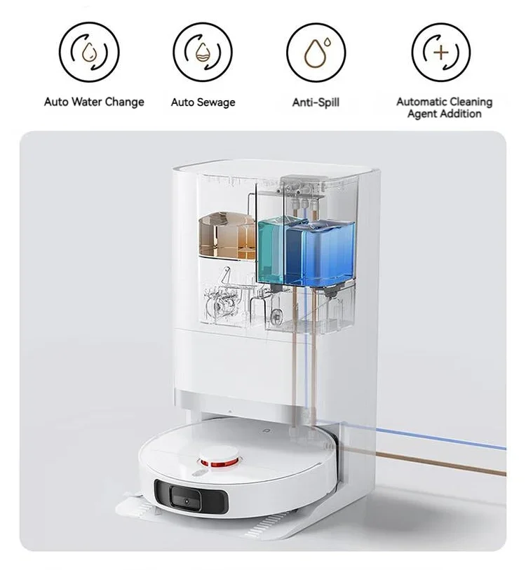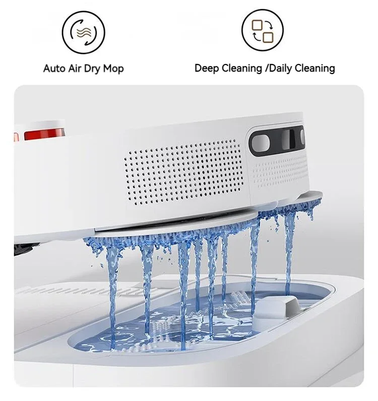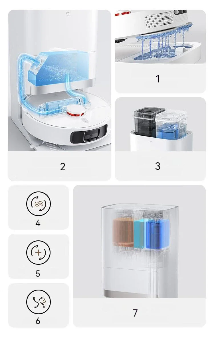 * La nueva actualización admite la recolección automática de basura, la limpieza automática de fregonas, el secado automático de fregonas al aire, la adición automática de líquido de limpieza y agua automática hacia arriba y hacia abajo (esta función requiere la compra de un dispositivo automático de agua de montaña hacia arriba y hacia abajo 2,0), para liberar completamente sus manos.