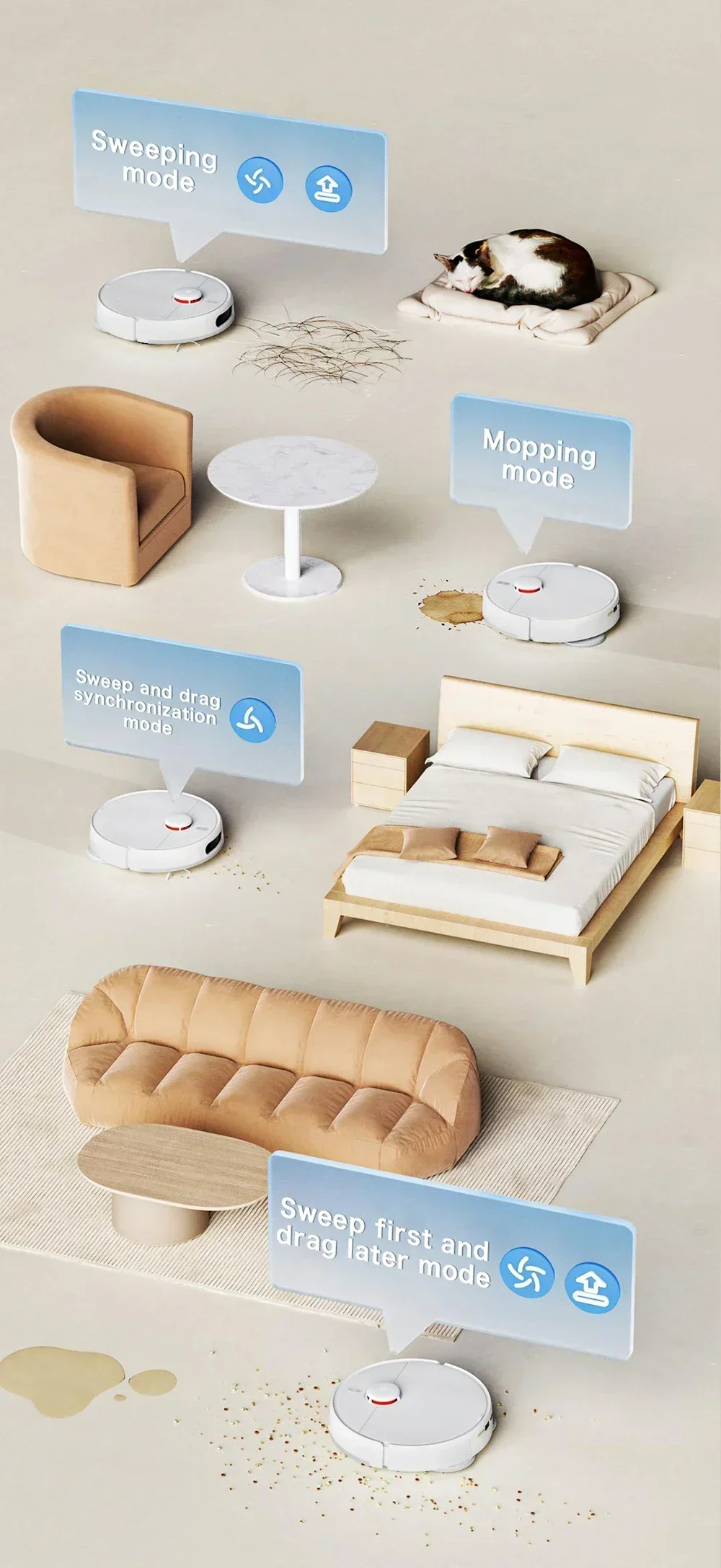 Sweep and mop synchronization: daily cleaning for the whole house, sweeping up dust while mopping up dirt.