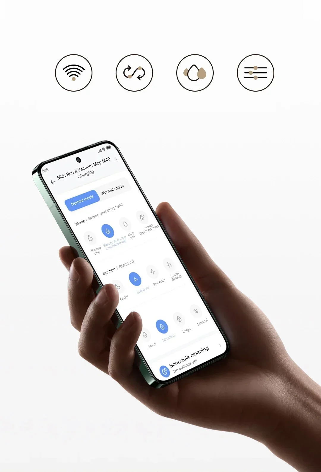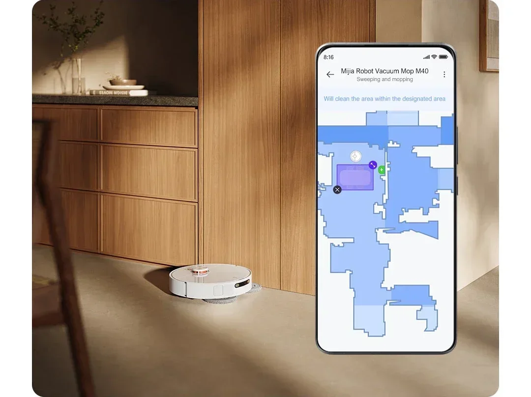 While out, you can start cleaning tasks remotely via the Mi Home app, with options for scheduled cleaning and zone settings, giving you full control over home floor cleaning.
