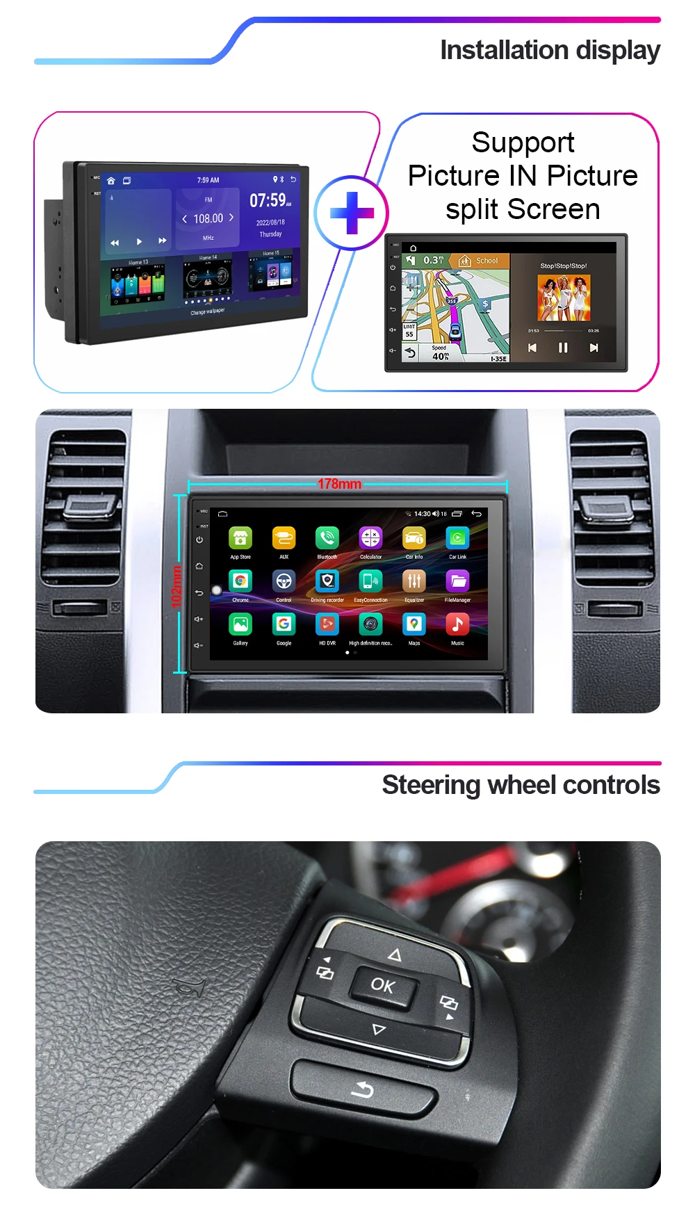 - Special Features: Built-in Gps,Mobile Phone,MP3 players,Voice Control,dsp,CarPlay,android auto,Reversing Input,Split Screen