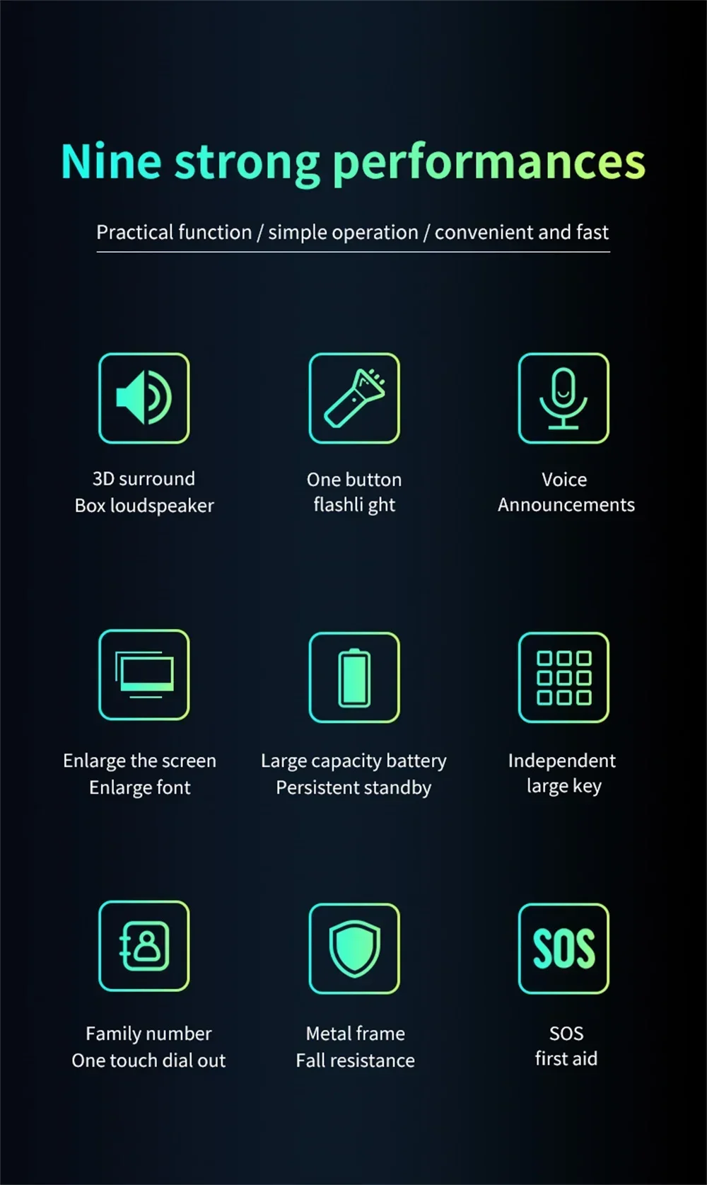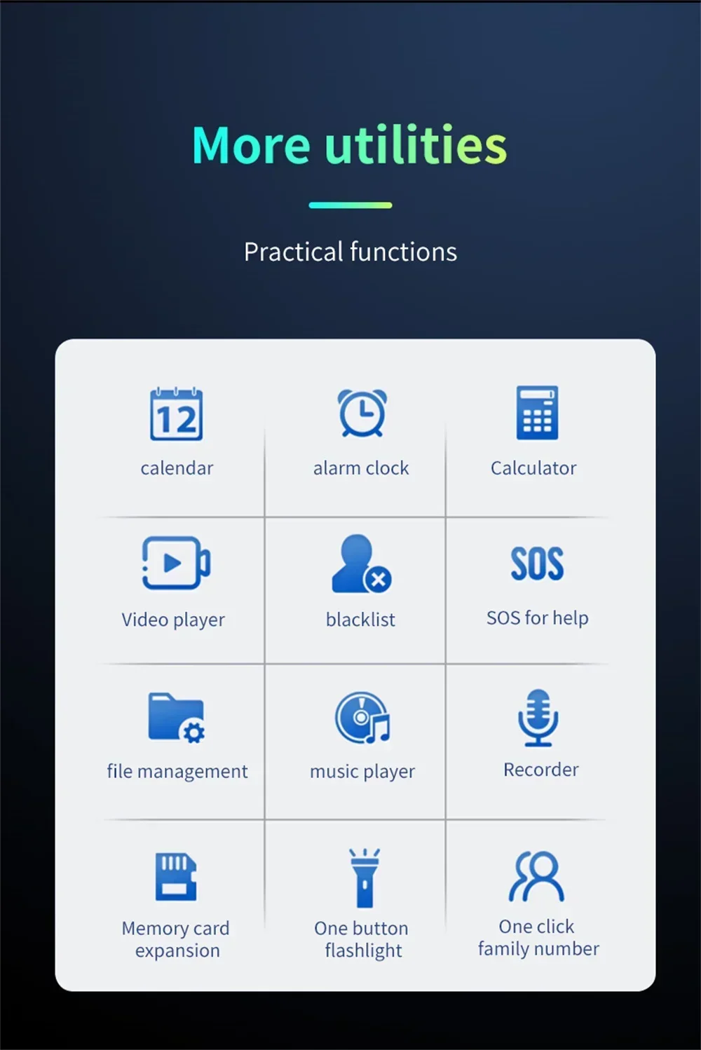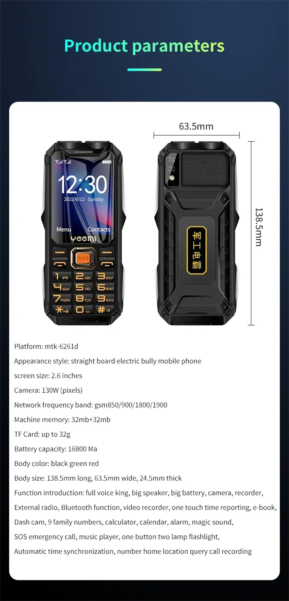 Function: camera, Mp3, mp4 , Movie king,Calculator, e-book, calendar, Unit conversion, Flashlight ,the family number, SOS, radio, bluetooth