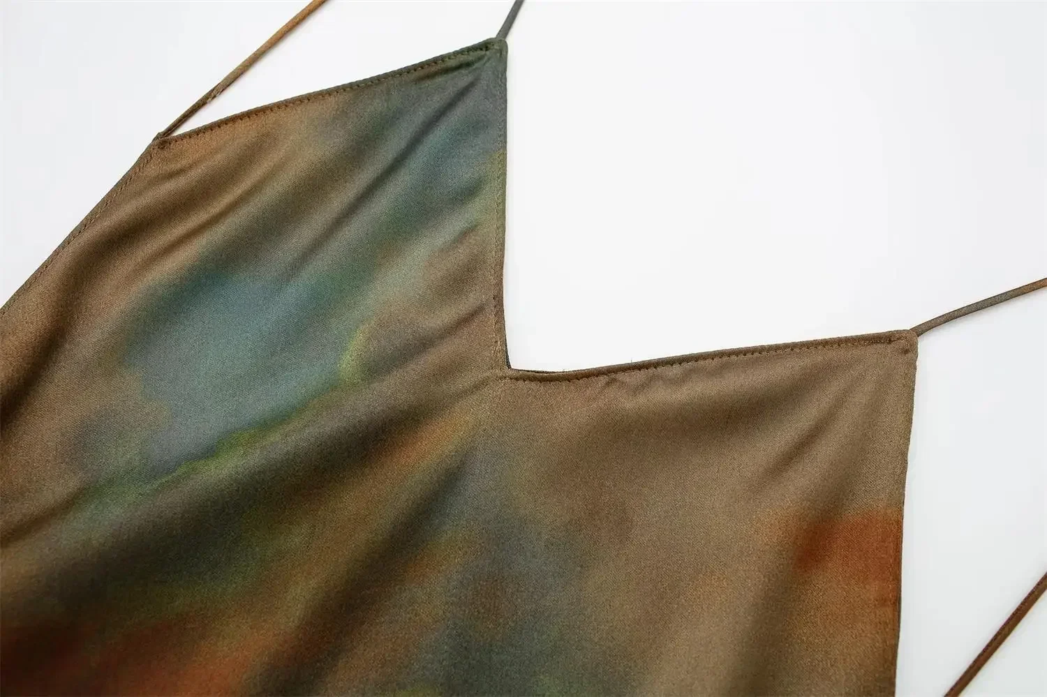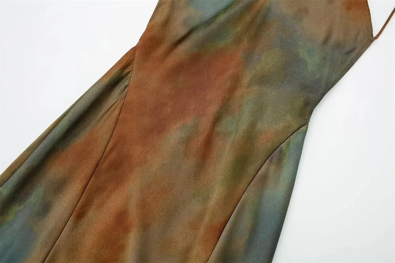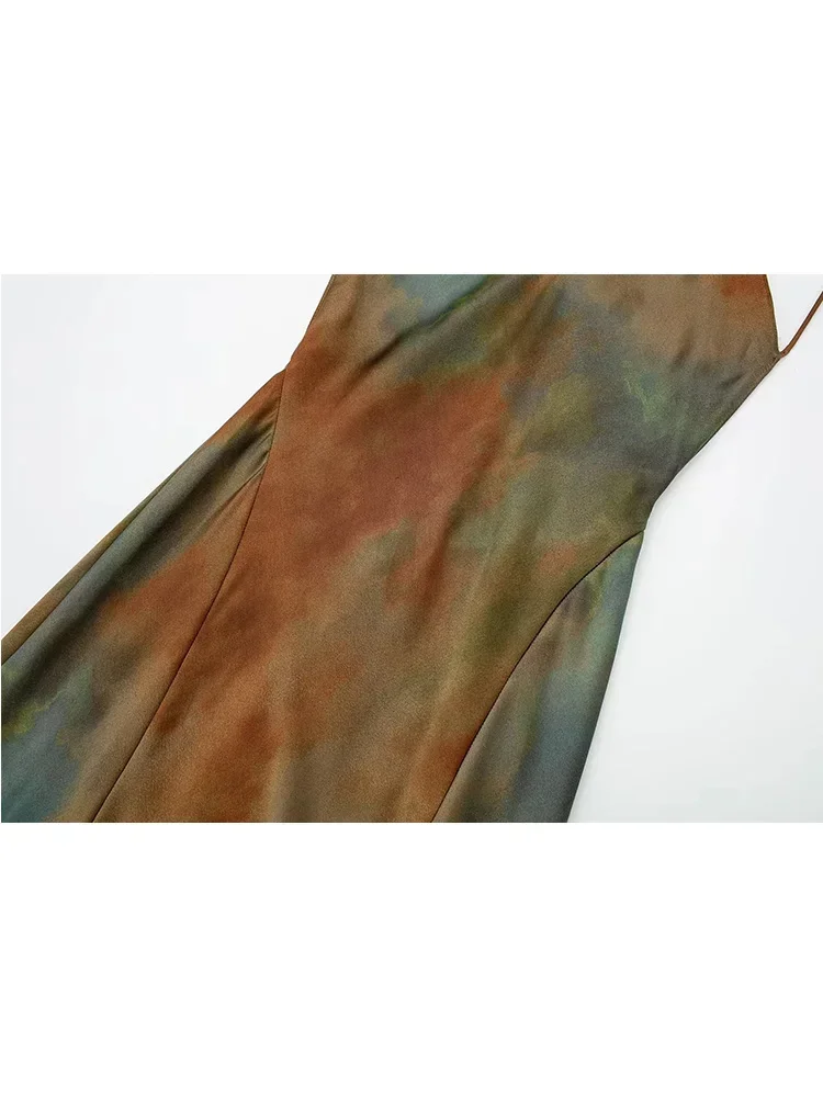 ZADATA 2024 Summer New Women’s Open Back Sleeveless Dress Fashion Satin Mid Length Dress Printed Sexy V Neck Sling Dress